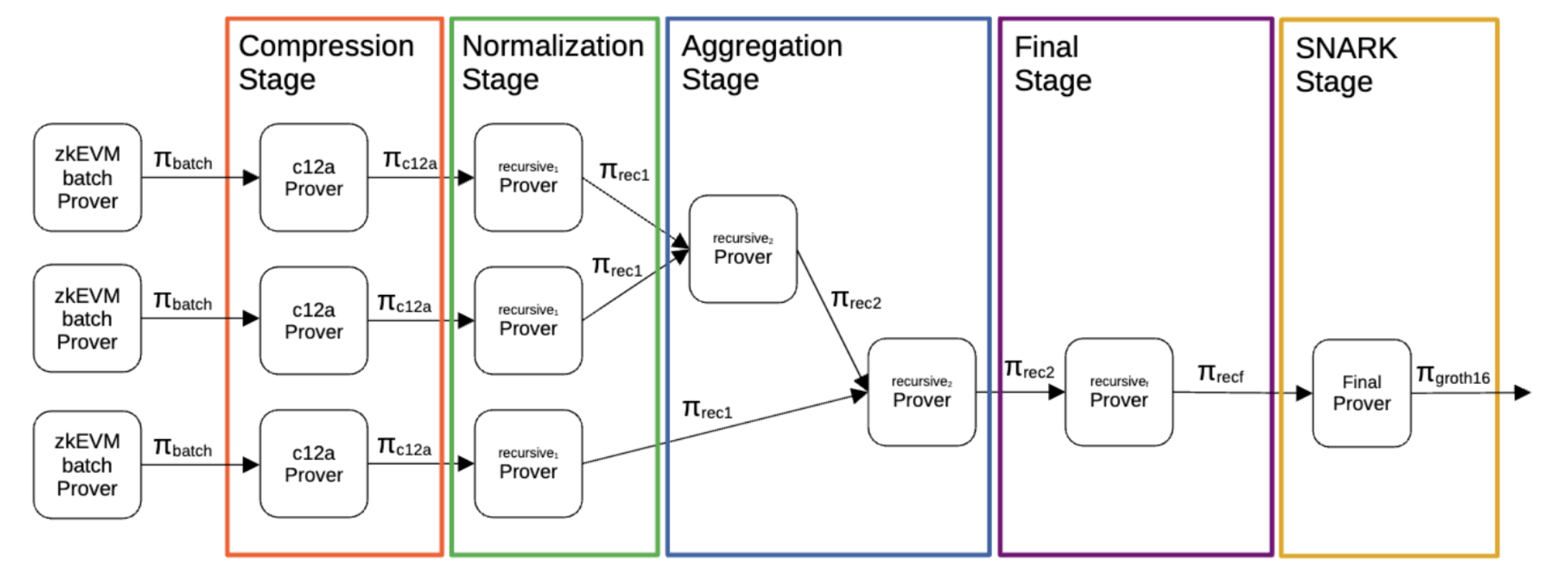 Zero-knowledge Part: Polygon zkEVM generates proofs of CI through a pipeline. In this pipeline, eSTARK [8] is utilized to perform proof recursion, aggregation and composition while Groth16 [1] or fflonk [10] is employed for proof compression. Because of the monolithic design of its ZK circuits, Polygon's prover is highly optimized to run on CPUs of a single powerful node.