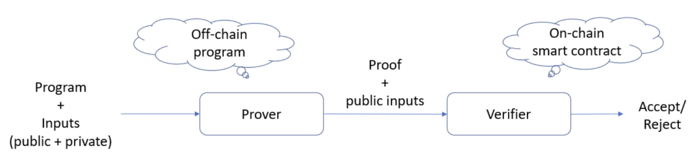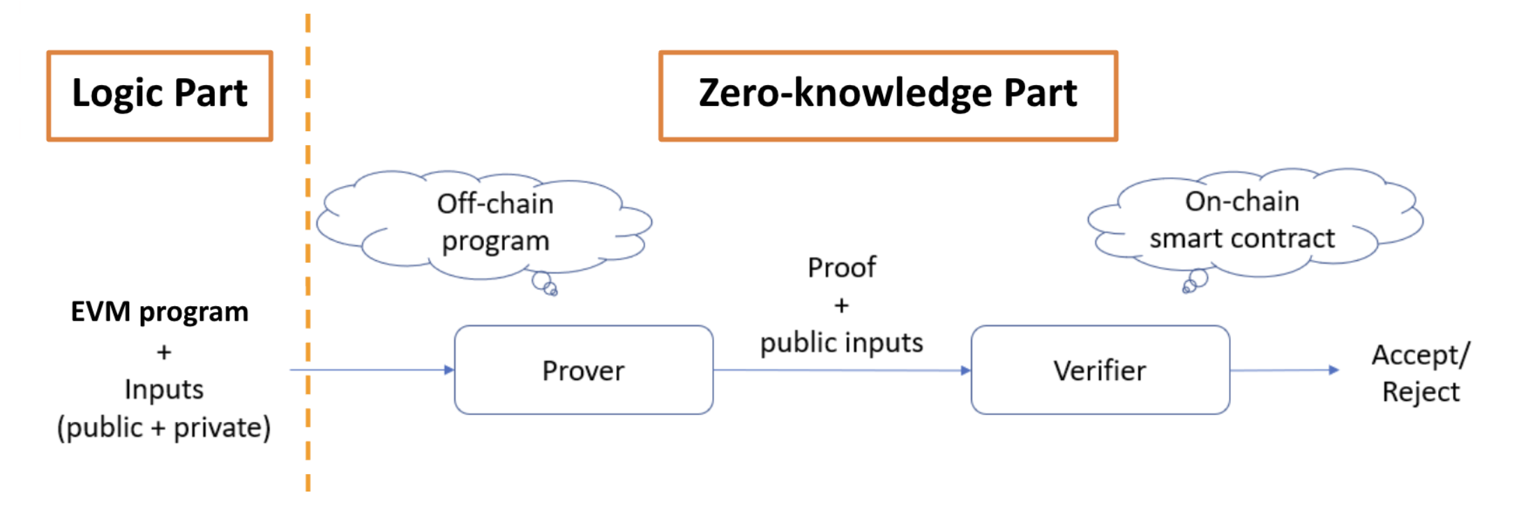 - Prover: Off-chain program that generates proof given the EVM program and inputs