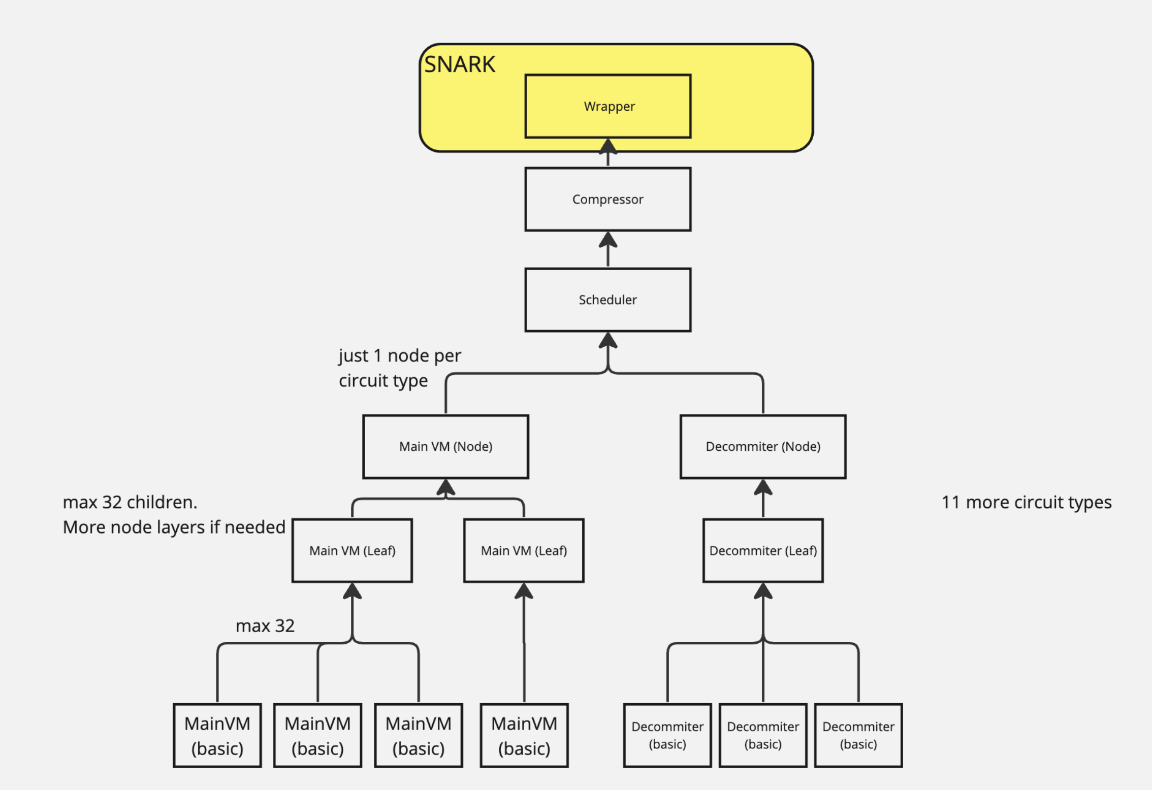 Zero-knowledge Part: zkSync Era uses a proof system called Boojum - an instantiation of RedShift [11]. A major source of inspiration for Boojum's design is Plonky2 - a transparent zk-SNARK tailored to fast recursive composition. In total, zkSync Era utilizes three types of ZK circuits: base-layer circuits, recursive-layer circuits and "AUX" circuits (see this document for more details). Overall, the proving architecture resembles a tree in which each node is a proof and every parent node is the aggregated proof of its children. Since the main ZK circuit of zkSync is divided into smaller circuits, zkSync Era's prover is able to scale horizontally as proof generation on base and recursive layers can be parallelized across a large cluster of CPUs or GPUs.