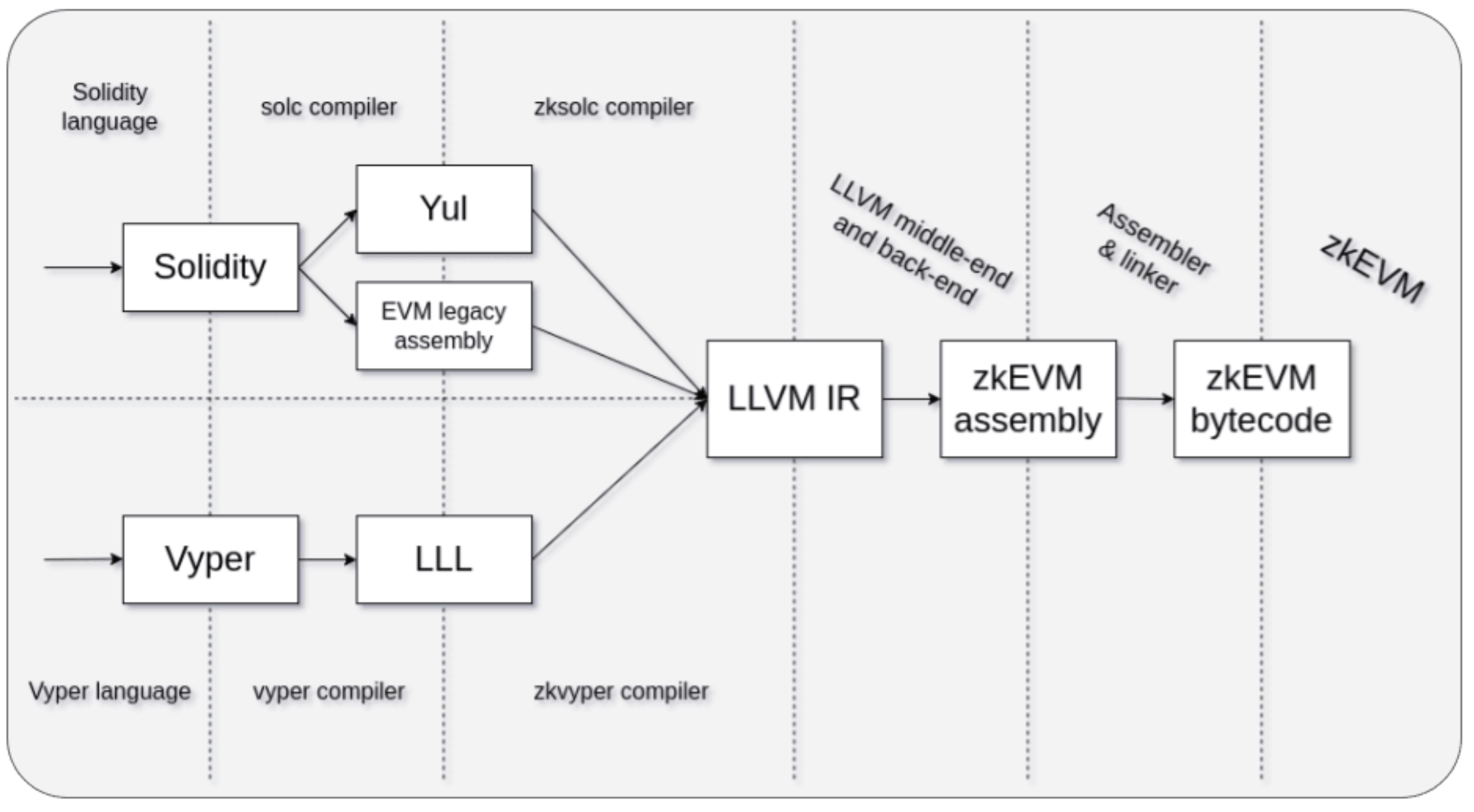 Since EraVM's instruction set is mostly different from that of EVM, it cannot interpret EVM bytecode directly like Polygon zkEVM. According to specification, EraVM only supports one native language called EraVM bytecode (a.k.a. zkEVM bytecode). In order to make this VM usable, the team at Matter Labs had to build a new toolkit for developers (zksolc/zkvyper for compilation, hardhat-zksync/foundry-zksync for debugging and testing). Compared to Polygon zkEVM, the compiler toolchain of zkSync Era is quite complicated.