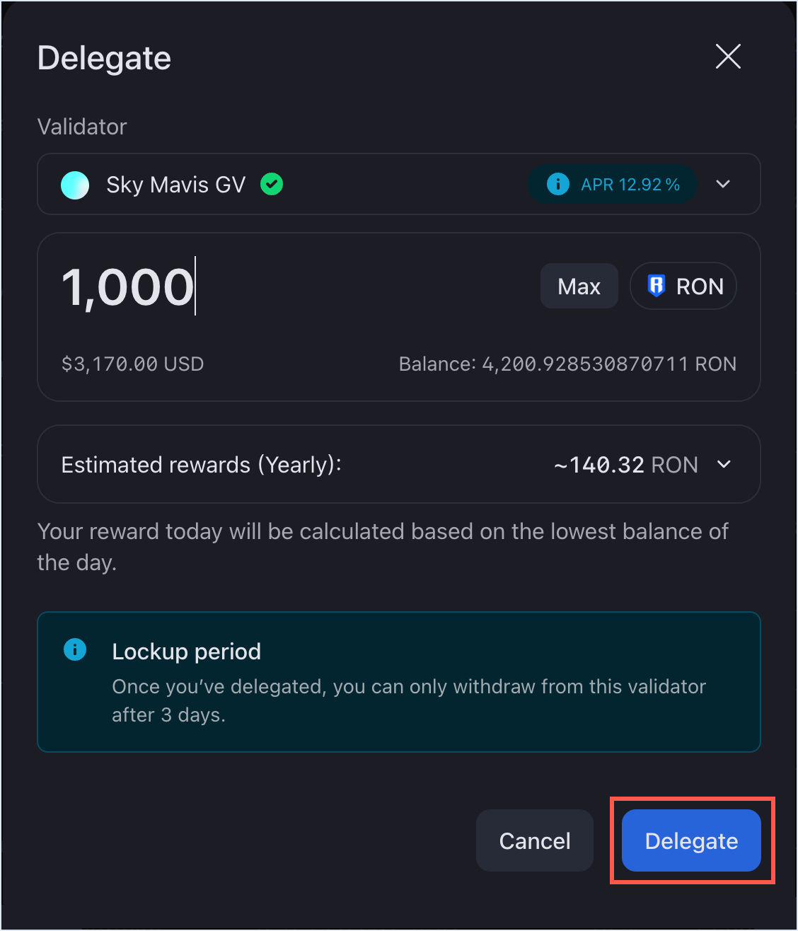 On the All validators tab, choose a validator to stake your RON with, and then select Delegate.